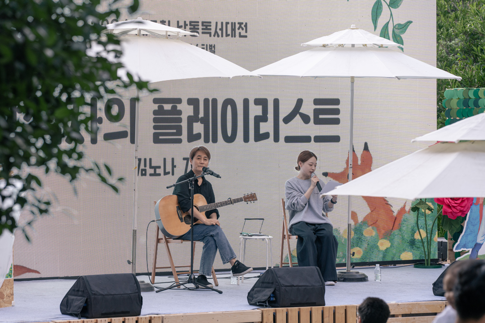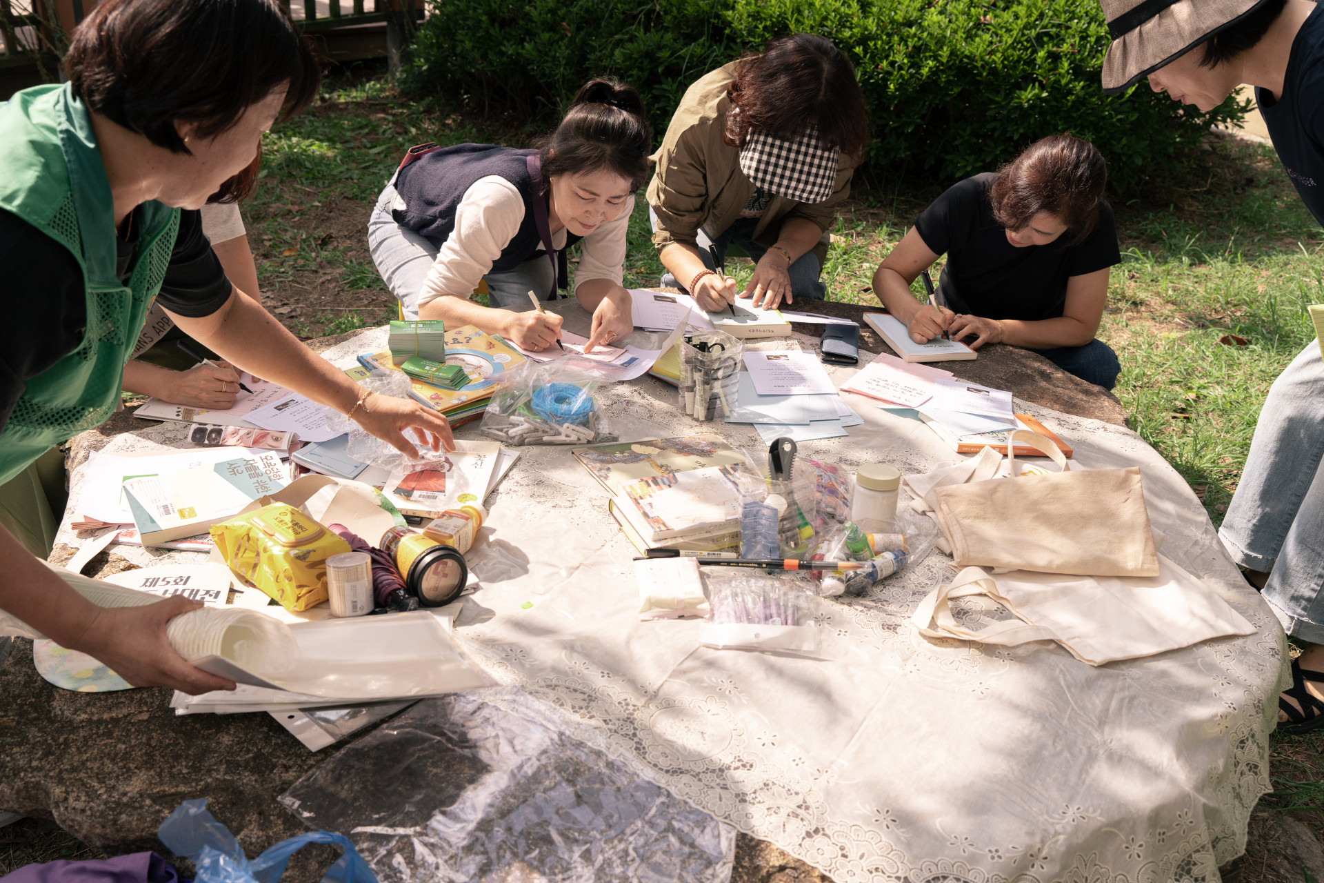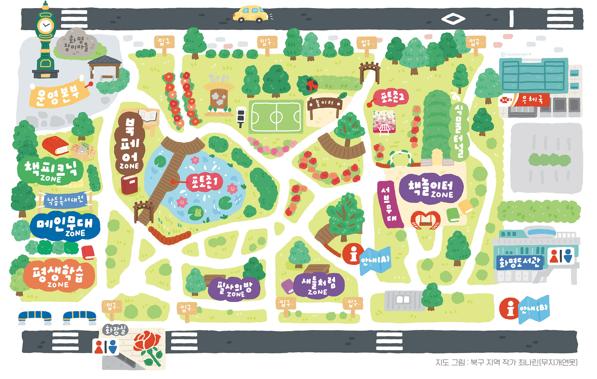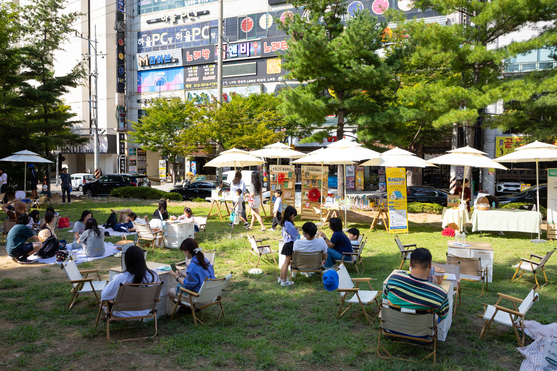 화명장미공원 잔디밭에서 펼쳐지는 야외 피크닉 공간으로 비치된 책과 캠핑 의자에 앉아 함께 자유롭게 즐기는 공간을 제공하였습니다. 그리고 화명도서관과 연계하여 시민북큐레이션 & 초청작가 북컬렉션 전시도 진행되었습니다.